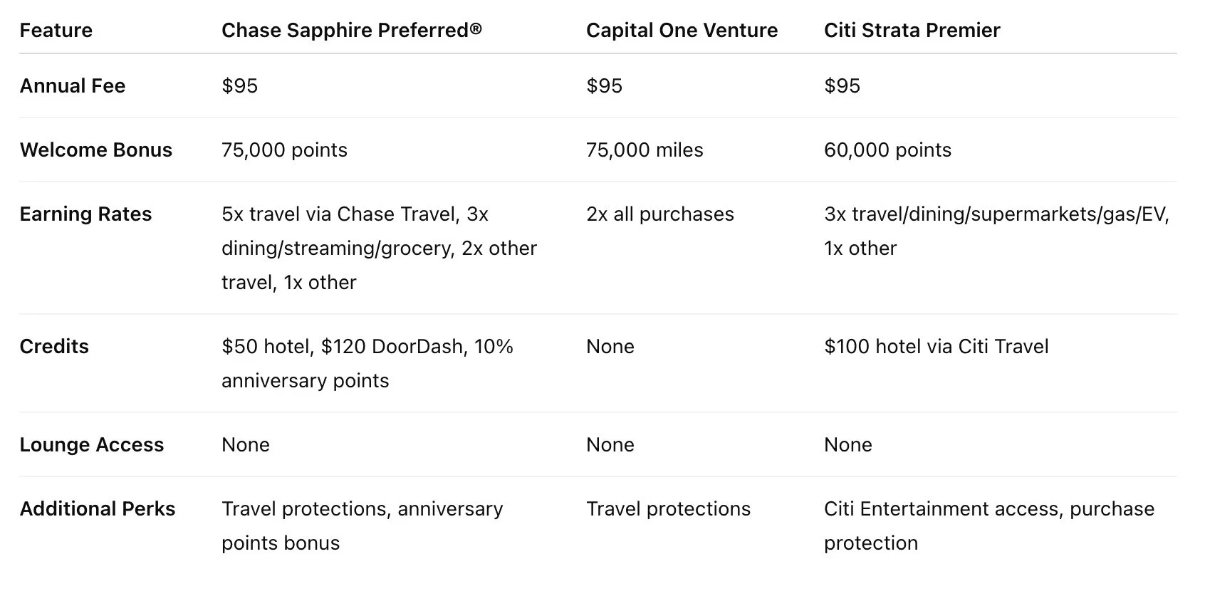 Consider your spending habits when choosing: CSP rewards dining and travel, Venture rewards everything evenly, Strata Premier rewards specific everyday categories.