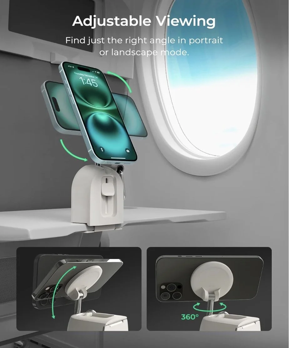 It features a 360° swivel head for easy adjustments and works with MagSafe, Qi2, and most iPhone/Android phones thanks to the included magnetic ring. It’s small, lightweight, and genuinely makes flying more enjoyable.