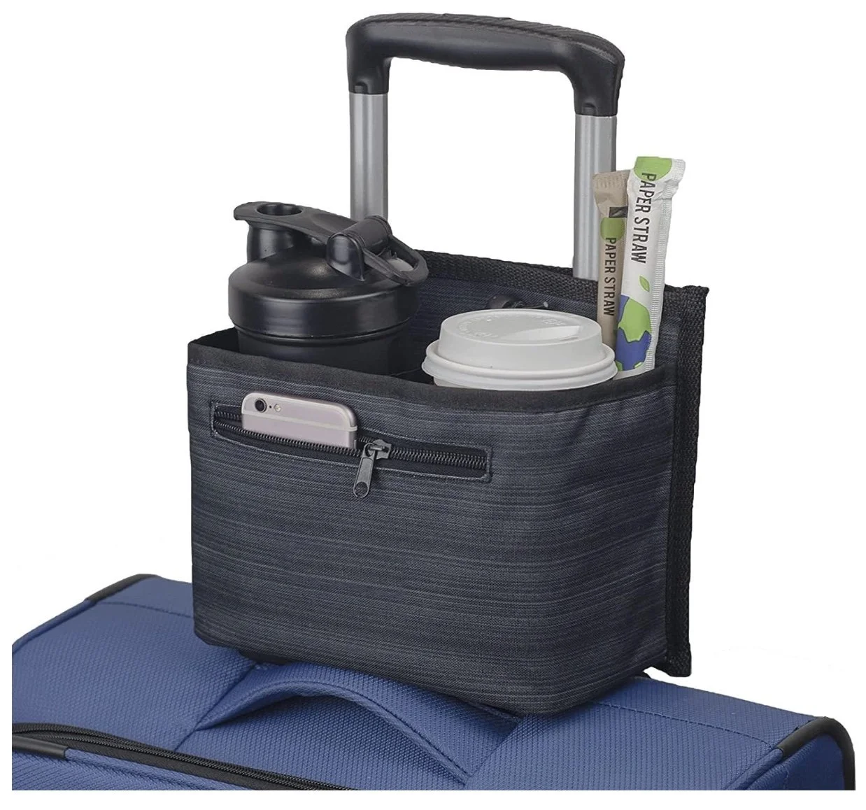 Every frequent traveler knows the struggle: juggling a suitcase, personal item, boarding pass, and a hot coffee while racing to a gate. This cup holder attachment solves the problem. It slips over the suitcase handle and securely holds drinks, tumblers, or even snacks — freeing up both hands.