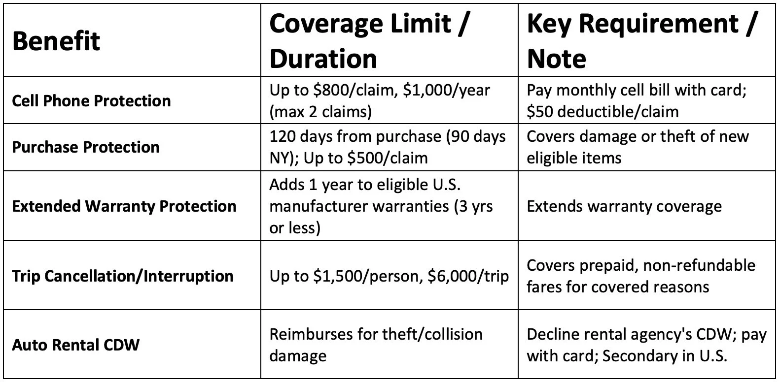 Purchase Protection: Covers your eligible new purchases against damage or theft for 120 days from the date of purchase (Note: 90 days for New York residents). Coverage is limited to $500 per claim. This adds a layer of security when buying new items.