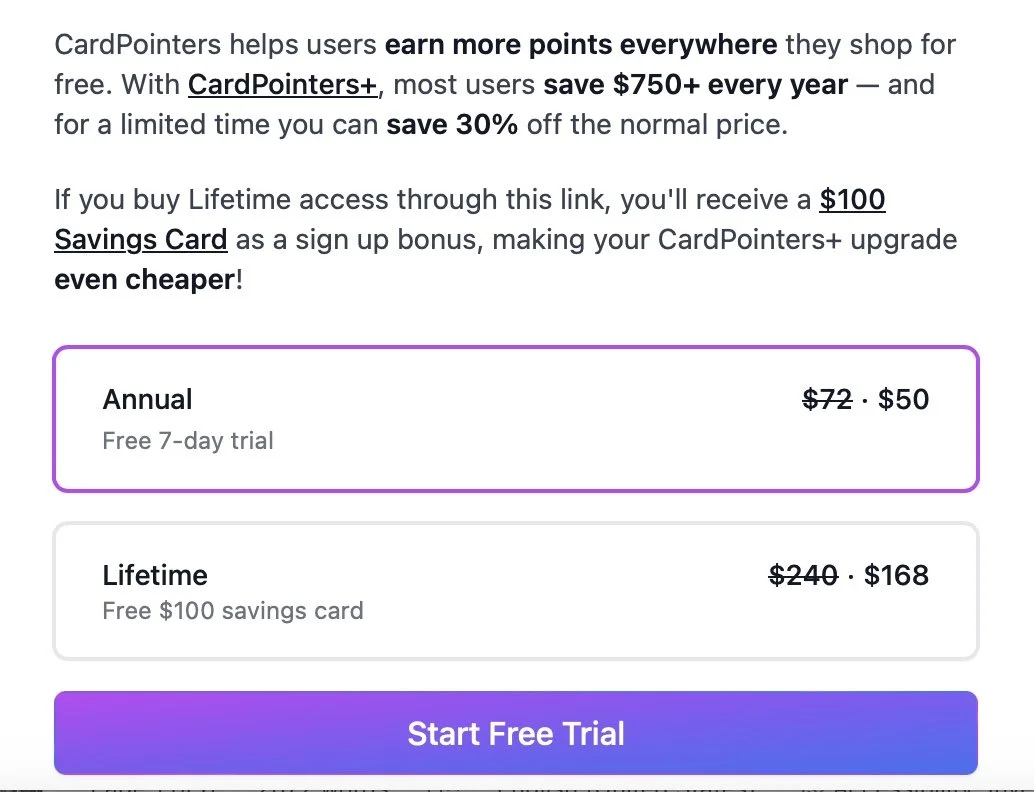 The lifetime plan for this tool is actually very cheap and has saved me thousands of dollars since I’ve been using it. Sometimes you need to spend a little money to save a lot of money, and if you hold any cards with annual fees, then you likely already understand this principle. Because I think it’s such a valuable tool for our community, I reached out to the creator of CardPointers, and he was kind enough to offer a special discount just for the Miles with Mary community.