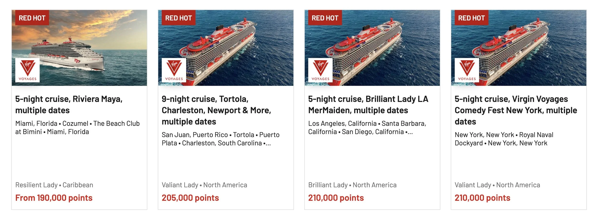 When you search Virgin Voyages sailings through Virgin Red, you will see pricing displayed entirely in points. Most balcony cabins for two people fall somewhere between 175,000 and 300,000 points and up depending on the length of the cruise, cabin category, and sailing date.