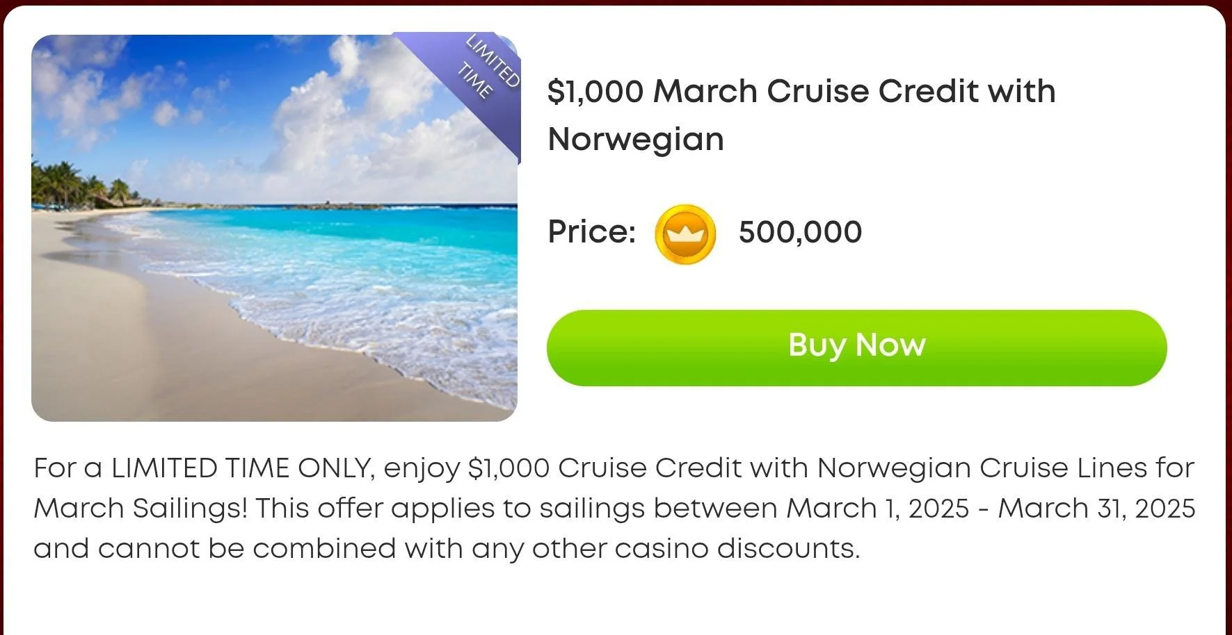 These might offer $500–$1,000 off your cruise fare. I personally prefer these because you avoid daily admin fees (NCL specific), and can stack them with public promotions or cruise certificates.